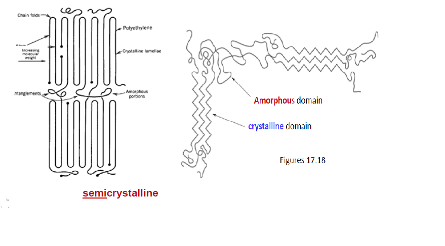 고분자는 고분자를 이루는 chain의 배열상태에 따라 두 가지로 나눌 수 있다. 무작위적으로 배열된 chian 영역을 amorphous polymer라고 하고, 규칙적으로 쌓아올려진 영역을 crystalline polymer 이라고 한다. 대부분의 고분자는 100% amorphous 하거나 crystalline 하지 않고, 두 영역이 혼합된 semi crystalline 배열을 하고 있다.