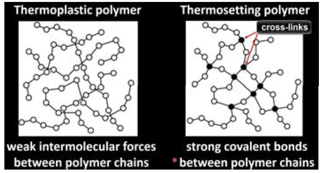 thermosetting(열 가소성)은 thermoplastic과 반대대는 성질로, 열을 받으면 고체화되어 가교된 매트릭스를 형성하는 것을 뜻한다. 주로 highly crosslinked matrix polymer에서 나타나는 성질이다. epoxy resine이 대표적인 예시이다. 아래 그림을 보면 thermoplastic과 thermosetting간의 차이가 잘 나타나 있다. thermoplastic의 경우 엉켜있는 고분자 사이에는 단지 약한 반데르발스 힘만 작용한다. 반면 thermosetting의 경우 crosslink가 일어나 엉켜있는 고분자 사이에 강한 covalent 결합이 존재해 열,용매,물리적인 충는 에 강한 특성을 보인다.