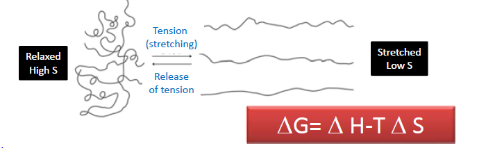 깁스 프리 에너지의 변화로 고분자가 탄성채인 이유를 열역학적으로 해석할 수 있다. H(엔탈피)는 분자 사이의 interaction과 관련이 있기 때문에 고분자가 Tension이 되어도 거의 값이 변하지 않는다. S(엔트로피)의 경우 polymer가 release 되면 bond length, tortion angle, valance angle의 많은 경우의 수를 가질 수 있어 엔트로피의 값이 높다. 그러나 tenison이 되었을 때 기존에 불규칙적인 배열이 stretched 되기 때문에 엔트로피의 값이 낮아지게 된다. 따라서 G값은 Tension이 되는 경우에 더 낮아지게 되고, polymer가 탄성력을 갖게 된다.