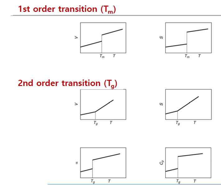 n차 전이의 정의는 깁스 플이 에너지의 n차 미분값이 불연속이 되는 지점을 뜻한다. 여기서 깁스 프리 에너지의 1차 미분으로 표현되는 V와 S는 1차 전이 온도에서 불연속적으로 변하게 된다. 깁스 프리 에너지의 2차 미분으로 표현되는 Cp와 α는 2차 전이 온도에서 불연속적으로 변하게 된다. Tm(녹는점)은 항상 1차 전이 온도이고 Tg(유리 전이 온도)는 항상 2차 전이 온도이다. 따라서 Tm과 Tg에서 polymer의 성질 값들의 변화는 다음 그래프와 같다.