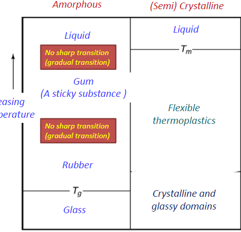 amorphous 영역을 가열하면 Tg에서 한 번 volume의 급격한 증가를 지나 rubber, gum, liquid까지 gradual 적인 transition을 보인다. 반면 crystalline 영역을 가열하면 glass상태가 점차 flexible해지며 Tm 이후에 liquid 상태로 변화하게 된다. thermoplastic(열가소성) 이란 열을 가하면 유연하게 변하는 성질을 뜻한다. 고분자는 일정 온도(Tg) 이상이 되면 thermoplastic 성질을 갖게된다.