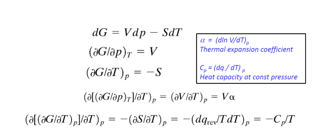 한편 깁스 프리 에너지의 열역학적 기본 식 dG=Vdp-Sdt를 보자. 일정한 온도에서 G를 P(압력)에 대해 편미분 하게 되면 V(부피) 가 나오게 된다. 일정한 압력에서 G를 T(온도)에 대해 편미분 하게 되면 -S(엔트로피) 가 나온다. 압력과 온도로 편미분 한 결과를 한 번 더 온도에 대해 편미분 하게 되면 각각 부피팽창률(coefficient of expansion)과 부피의 곱, Cp(등압 열용량)을 -T로 나눈 값이 나오게 된다.